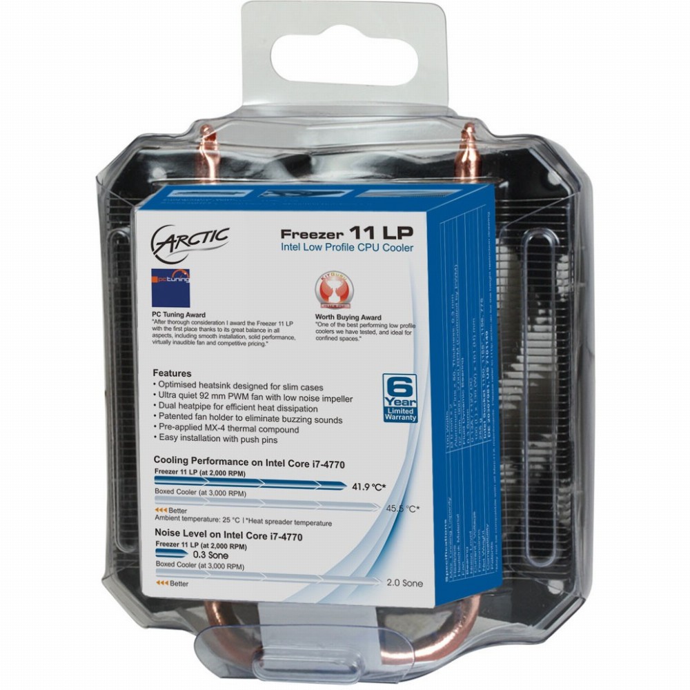 Eine Höhe von nur 55 mm und die Fähigkeit, seitlich zu belüften, machen den Freezer 11 LP zu einem außerordentlich schmalen Kühler, der in jeden HTPC oder Computer mit flacher Bauweise passt. Sein geringes Gewicht hält die Belastung auf dem Motherboard minimal und macht es so transportsicher.