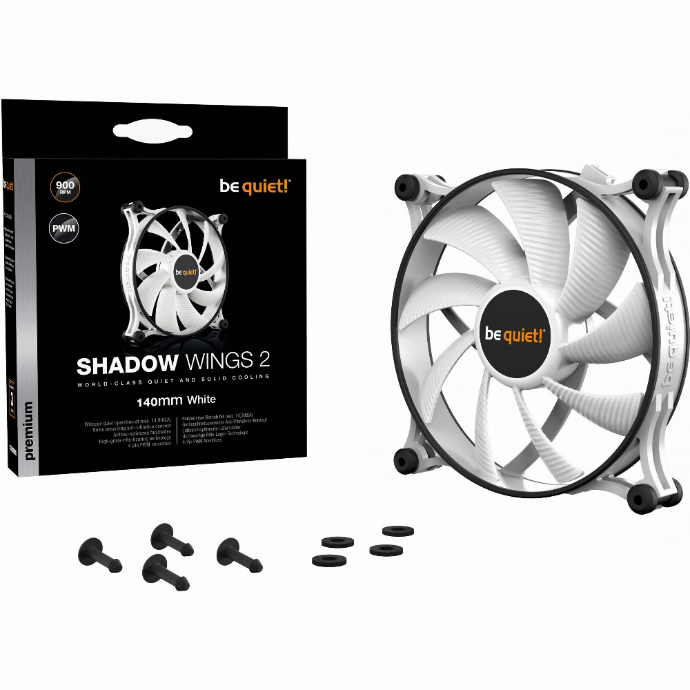 Der weiße Shadow Wings 2 140mm PWM bietet flüsterleisen Betrieb sowie zuverlässige Kühlung bei einer geringen Drehzahl.