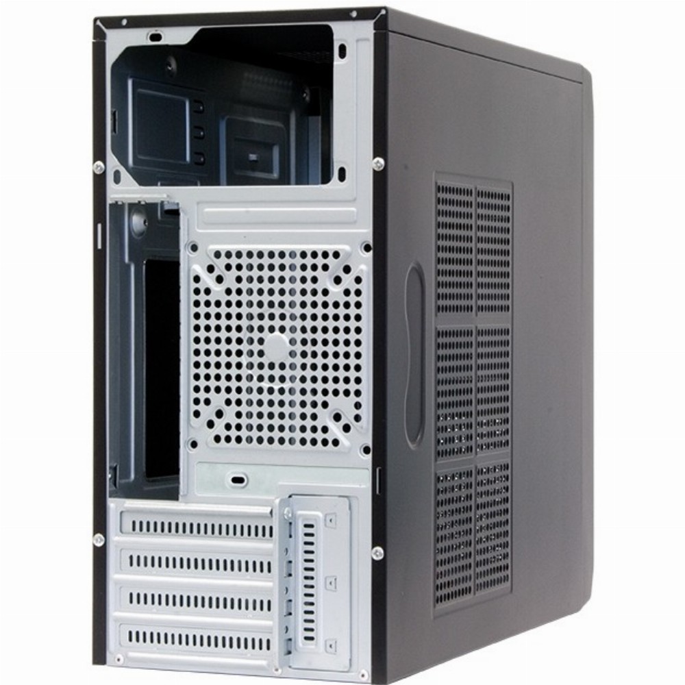 Die Kunststoff Frontblende des in mattschwarz gehal-tenen mATX Gehäuses ist gebürstetem Aluminium nachempfunden. Die Kühlung des Gehäuses erfolgt neben den großzügig bemessenen seitlichen Lüf-tungsgittern über einen an der Rückseite angebrachten (optionalen Lüfter, welcher 80, 90 oder 120mm groß sein darf.