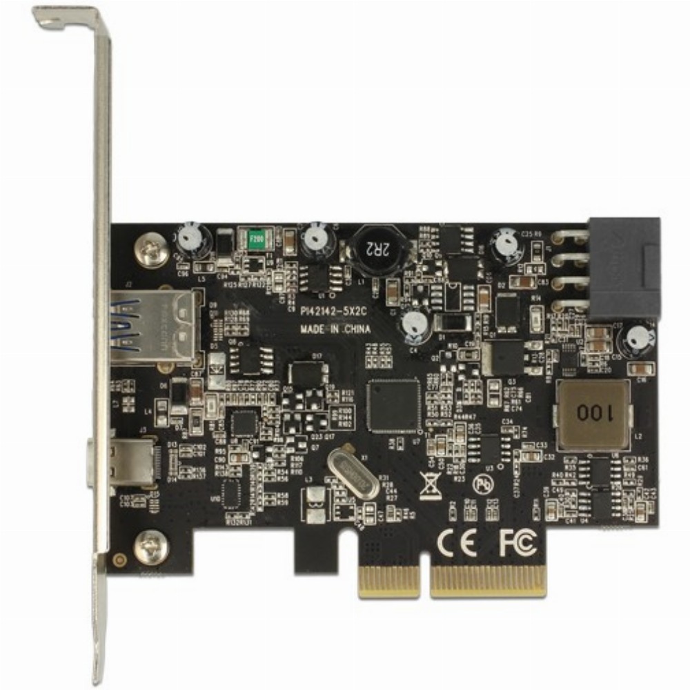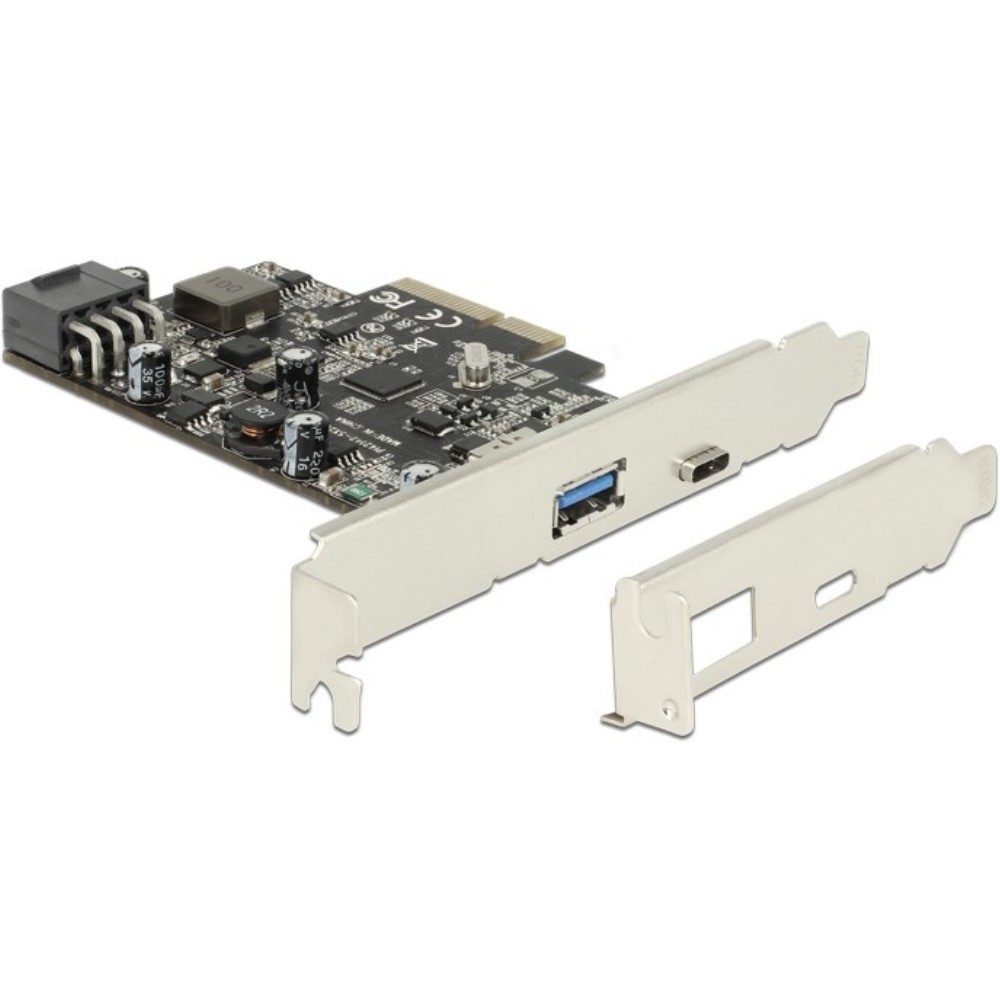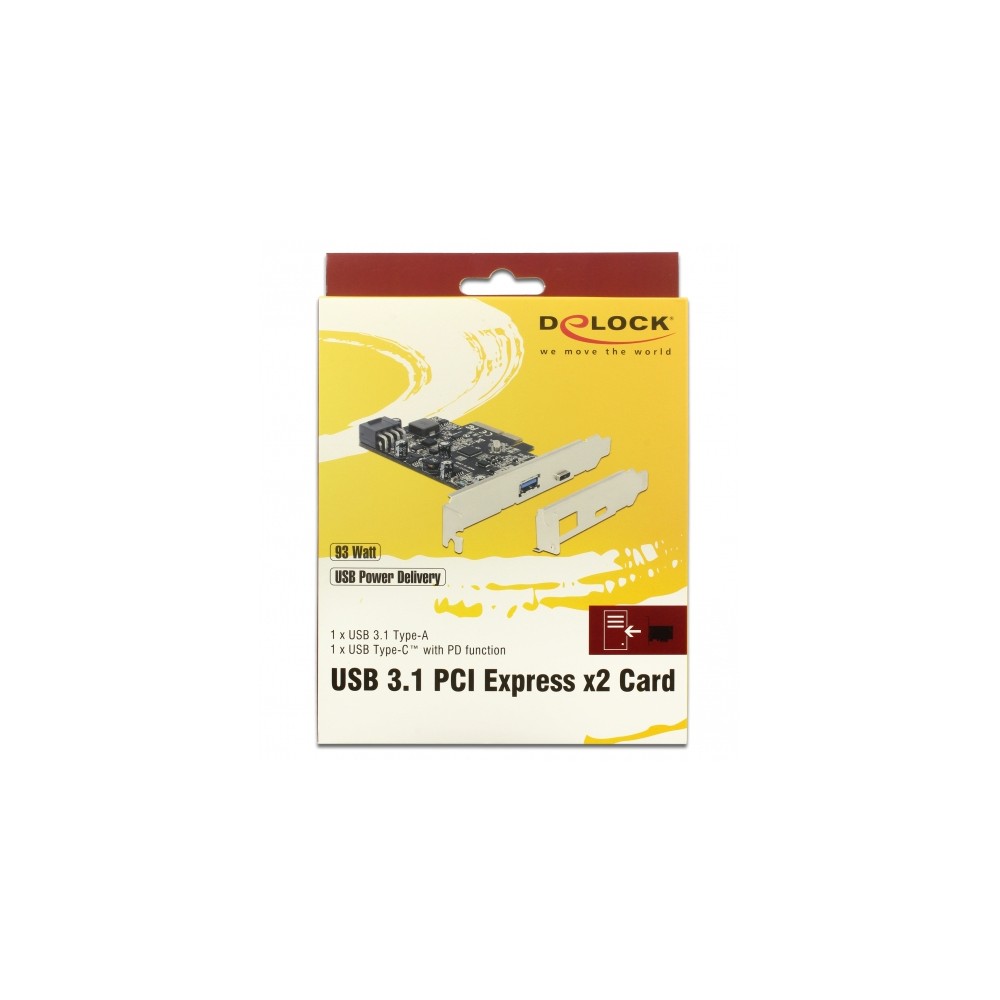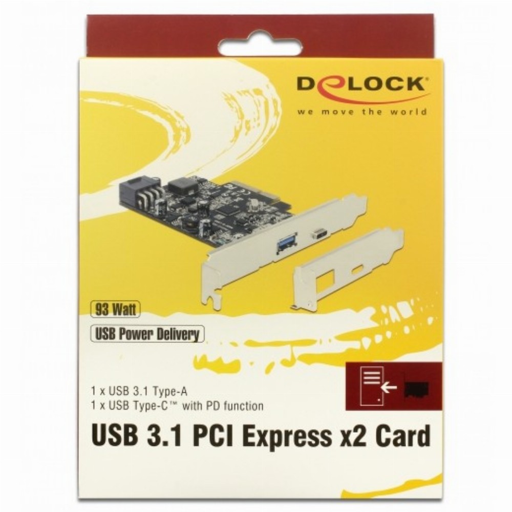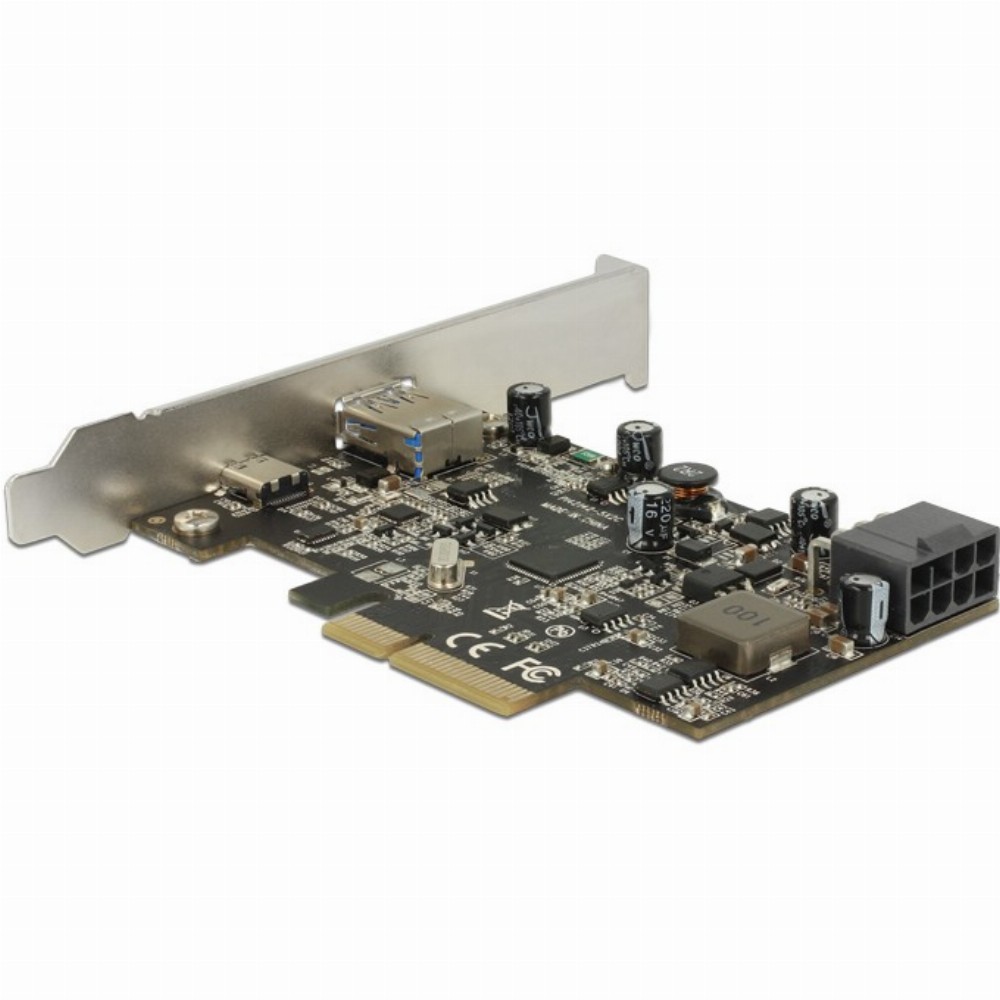 Die PCI Express Karte von Delock erweitert den PC um zwei externe USB 3.1 Ports. An die Karte können verschiedene USB Geräte, wie z. B. Docking Stationen, Card Reader, externe Gehäuse etc., angeschlossen werden. Der USB Type-C™ Port unterstützt die Power Delivery Funktion, womit zum Beispiel ein Drucker mit USB Type-C™ Anschluss angeschlossen werden kann. Der Drucker wird dann von der PCI Express Karte mit Strom versorgt.