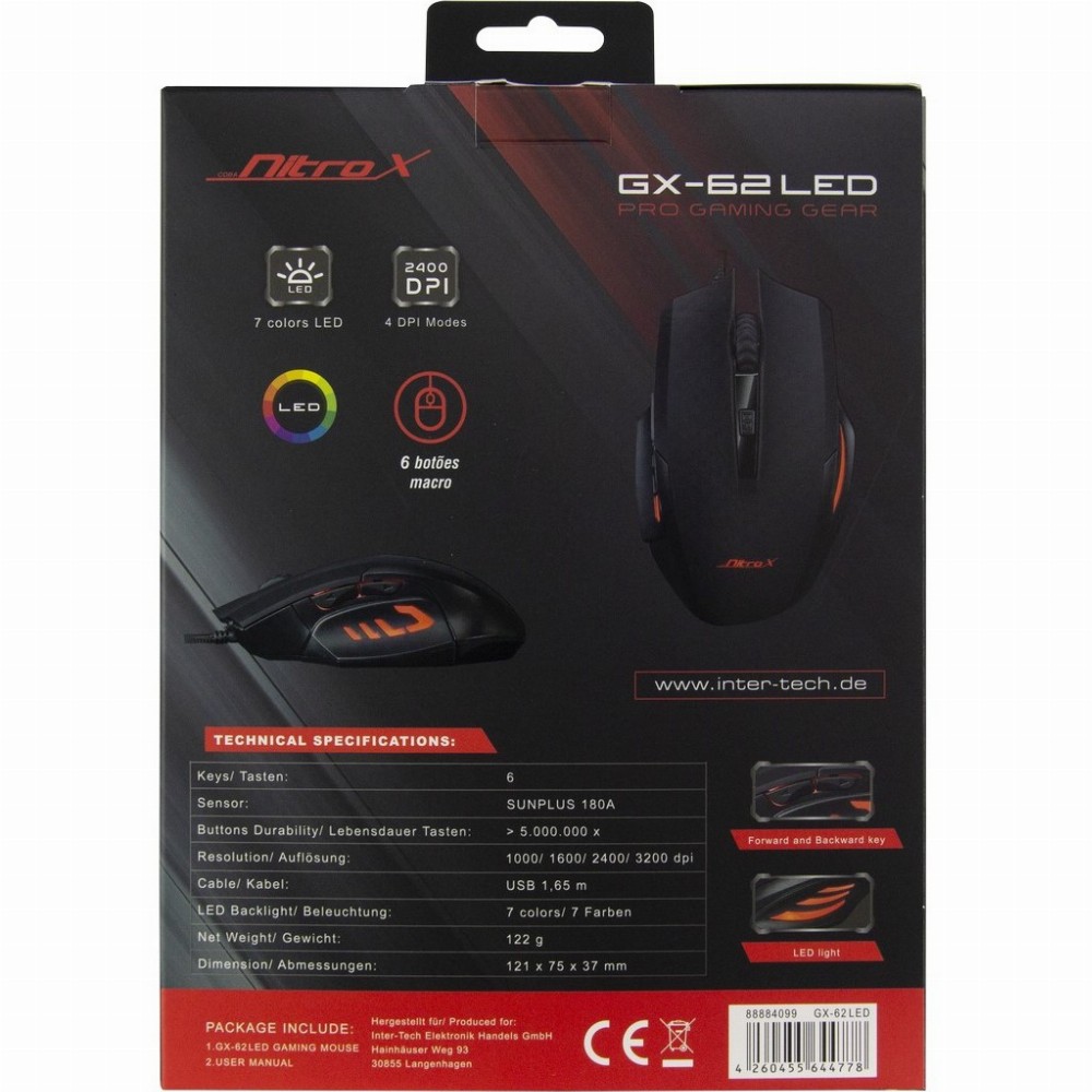Die Nitrox GX-62 LED Gaming-Maus ist das ideale Einstiegsmodell in den Gaming-Bereich. Neben ihrem ergonomischen Design und der RGB-LED-Beleuchtung, verfügt sie zudem über einen angenehmen, Tastendruck sowie ein leichtgängiges Scrollrad. Der verbaute SUNPLUS 180A Sensor, der in vier Stufen auf bis zu 3200dpi eingestellt werden kann, ermöglicht präzises Gaming und Arbeiten.