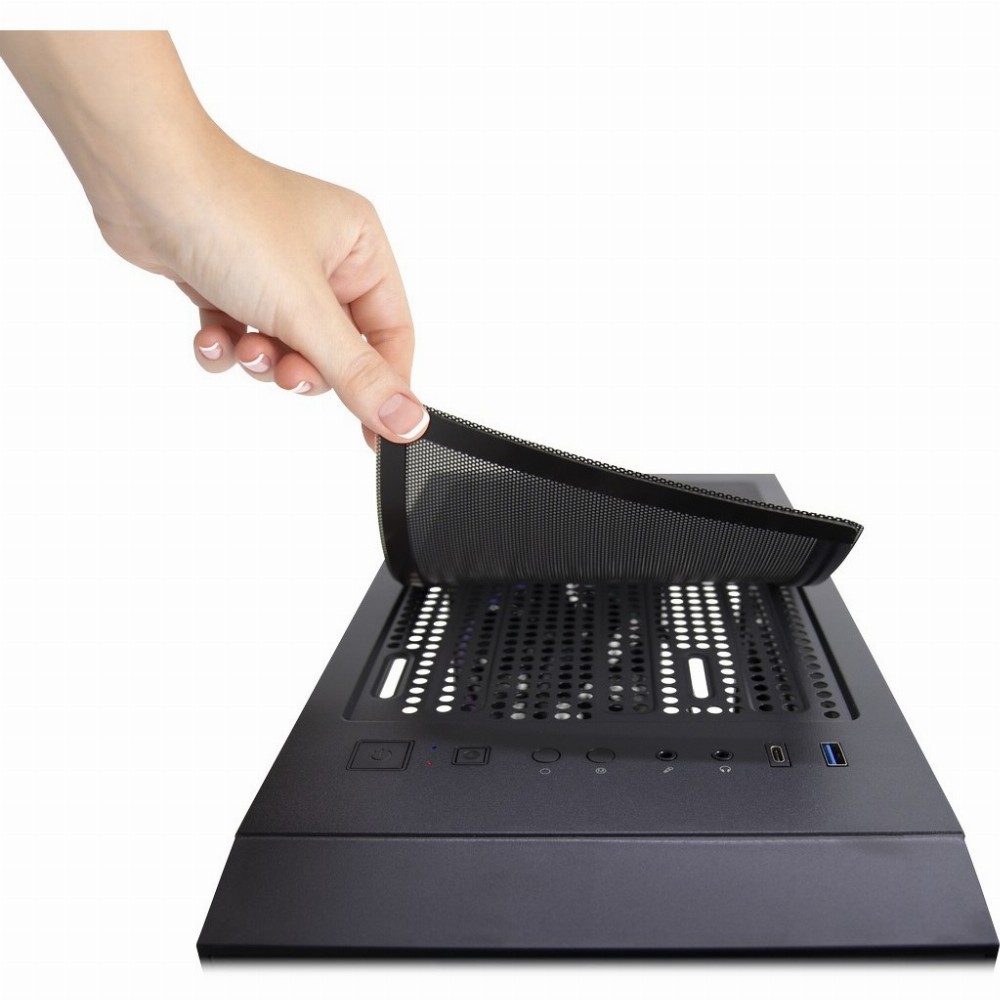 Neben dem einfach zu entnehmenden, magnetischen Staubfilter, befinden sich im Deckel sowohl die Taster für die manuelle Einstellung der RGB-Effekte und der Helligkeit, als auch ein USB 3.0 Type A und ein USB 3.0 Type C Anschluss.