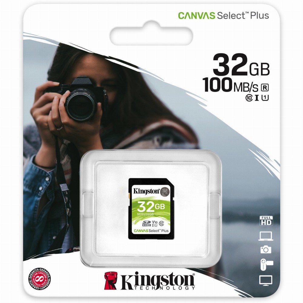 Kingstons Canvas Select Plus SD Karte wurde für außergewöhnliche Performance, Geschwindigkeit und Langlebigkeit bei hohen Workloads wie z. B. dem Übertragen und Entwickeln von hochauflösenden Fotos oder dem Aufnehmen und Bearbeiten von Full-HD-Videos entwickelt. Sie erreicht Geschwindigkeiten gemäß Klasse 10 UHS-I von bis zu 100MB/s* für einfaches Speichern und schnelles Übertragen zusammen mit einer hochentwickelten UHS-I-Schnittstelle, die Full-HD- und 4K-Ultra-HD-Videos in Kinoqualität aufnehmen kann. Die Canvas Select Plus SD Karte wurde für die rauesten Umgebungen und Bedingungen konzipiert, damit Sie sie überallhin mitnehmen können und dabei sicher sind, dass Ihre Dateien, Fotos und Videos geschützt sind. Verfügbar in verschiedenen Speicherkapazitäten bis 512GB** und mit einer lebenslangen Garantie.