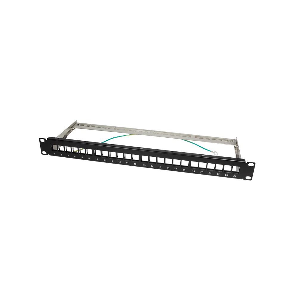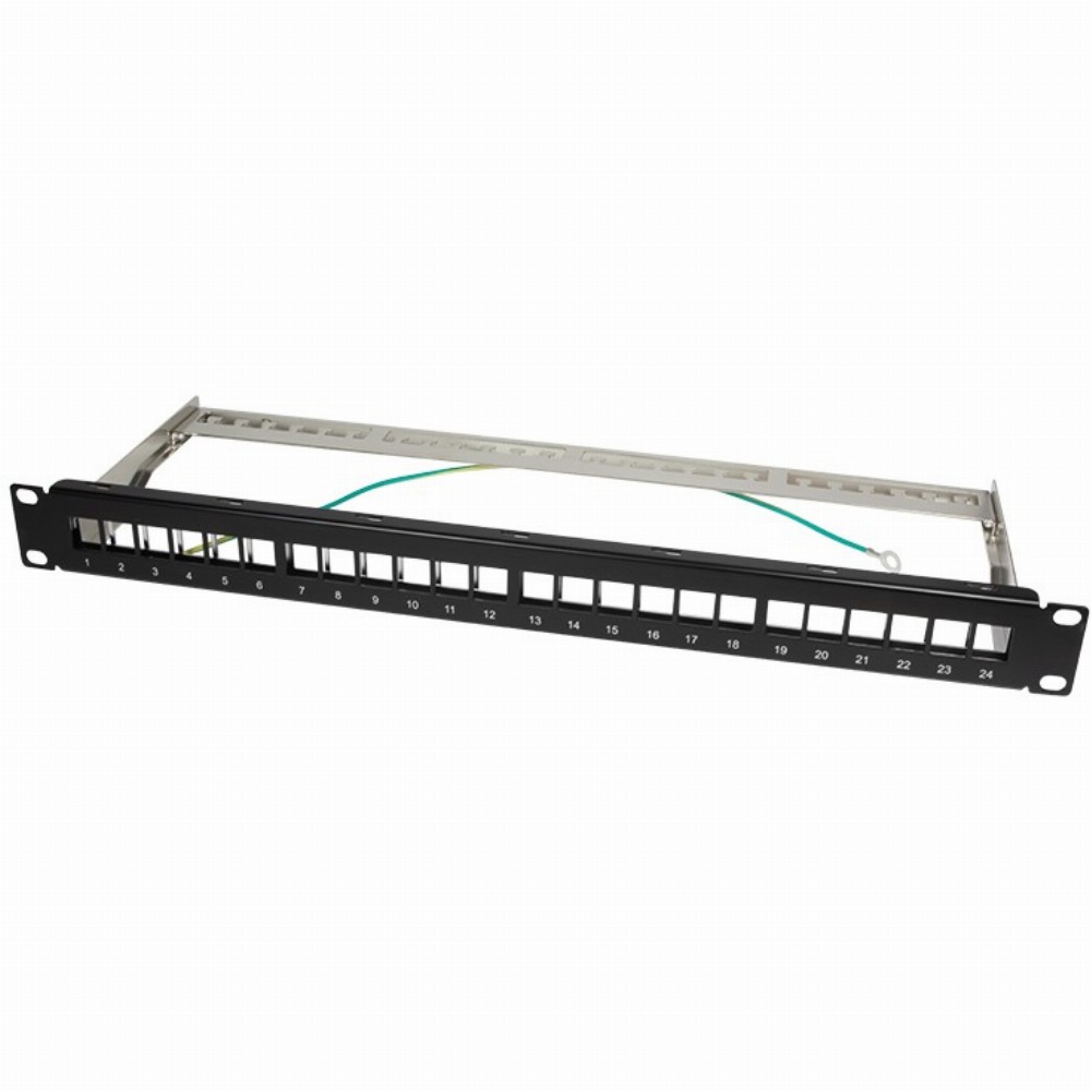19″ Verteilerfeld für die Aufnahme von maximal 24 Modulen mit schlanker Bauform. Die Module rasten ohne weiteres Montagezubehör mühelos in den 19″ Verteilerfeld-Rahmen ein. Das zusätzliche Innenblech sorgt für eine ganzheitliche Schirmung. Dieses Panel eignet sich optimal für geschirmte Cat.6 oder Cat.6A Keystone Module.