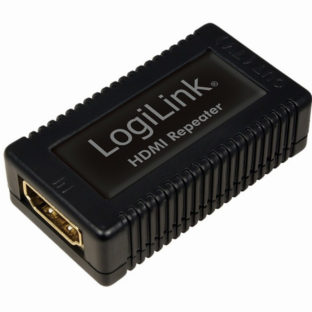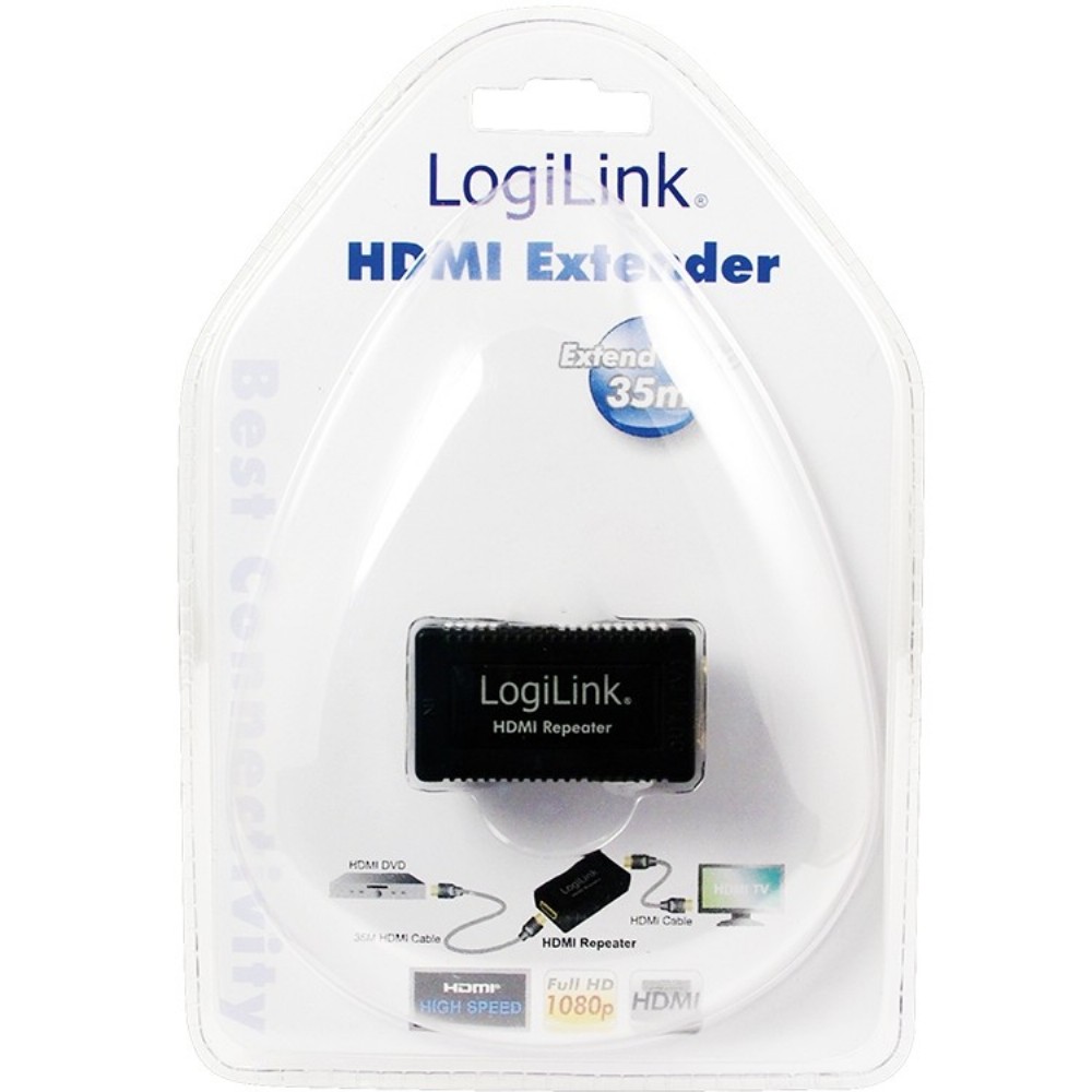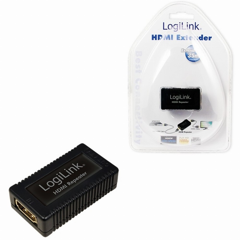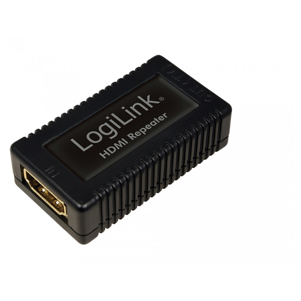 Adapter für die Verlängerung von HDMI Signalen von LogiLink. Der Repeater unterstützt HDMI Kabellängen von bis zu 35 Metern. Es lassen sich bis zu 4 dieser Geräte mit 35 Meter HDMI-Kabel hintereinanderschalten und somit wird eine maximale Entfernung von 145 Metern erreicht. Der Repeater unterstützt alle gängigen HDMI Standards, VGA Auflösungen bis zu 1900×1200 und überträgt das Audio 5.1 Signal.