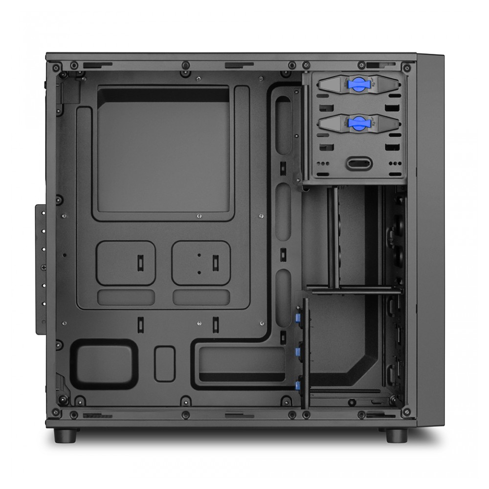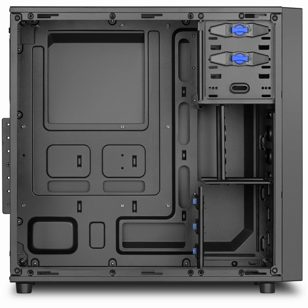 Das ATX-Gehäuse bietet drei 5,25″ Einbauschächte für optische Laufwerke (zwei davon sind mit Schnellverschlüssen ausgestattet) oder zwei 5,25″ Einbauschächte und einen extern zugänglichen 3,5″ Schacht. Hier lässt sich beispielsweise ein Kartenleser schnell und einfach einbauen. Intern können drei 3,5″ Festplatten mit Schnellverschlüssen eingebaut werden. Im zweiten Einbaurahmen lassen sich drei 2,5″ HDDs/SSDs einbauen, in der Unterseite des Gehäuses ist Platz für eine weitere 2,5″ HDD/SSD.